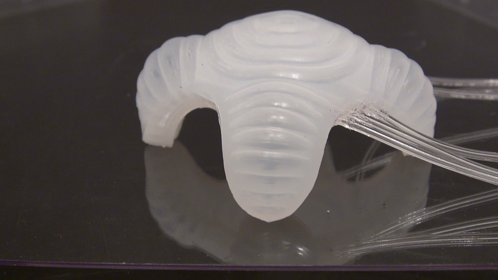Inspired by the cell locomotion that follows the process of protrusion, adhesion, de-adhesion, and movement (The Forces Behind Cell Movement by Revathi Ananthakrishnan), me is fabricated out of super-stretchy silicone that allows it to inflate dynamically with a pneumatic actuator. Solenoid valves are computer controlled to achieve its movement. The material is sturdy enough to exhibit force to pull its body forward. The fabrication technique was studied from Multigait Soft Robot by Robert F. Shepherd.
